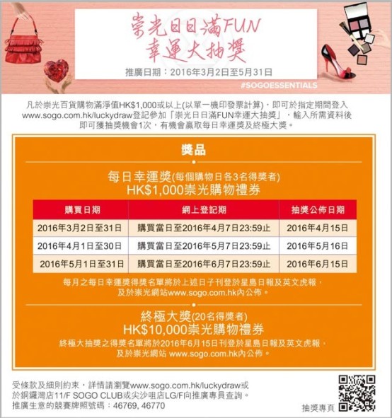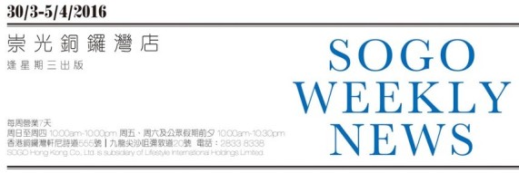 香港打折:sogo崇光百货铜锣湾店本周最新购物优惠(16年3月30日至4月5日)