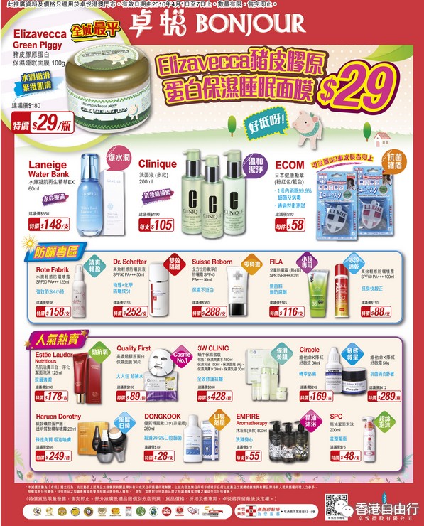 香港打折:全城最平 猪皮面膜特价$29一瓶!卓悦Bonjour最新门市优惠(16年4月1至7日)