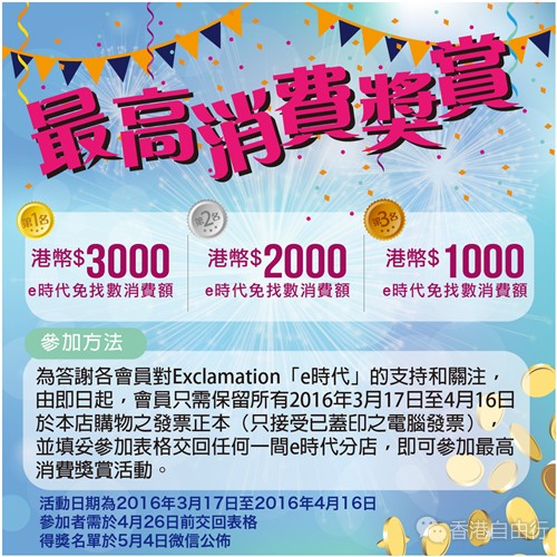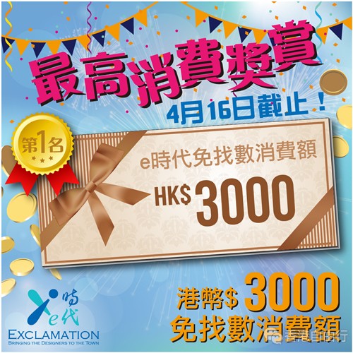 为答谢各会员对Exclamation「e时代」的支持和关注,由即日起,会员只需保留所有2016年3月17日至4月16日于本店购物之发票正本(只接受已盖印之电脑发票),并填妥参加表格交回任何一间e时代分店,即可参加最高消费奖赏活动。