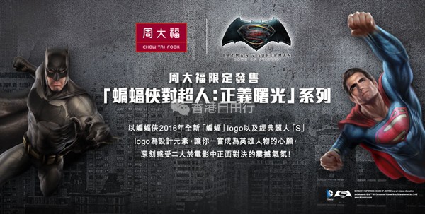 周大福全新蝙蝠侠对超人:正义曙光系列以蝙蝠侠2016年全新“蝙蝠”LOGO以及经典人物超人“S”LOGO为设计元素,让你一尝成为英雄人物的心愿,深刻感受二人于电影中正面对决的震撼气氛!
