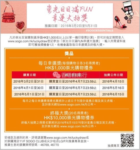 香港打折:sogo崇光百货铜锣湾店本周最新购物优惠(16年4月13日至4月19日)
