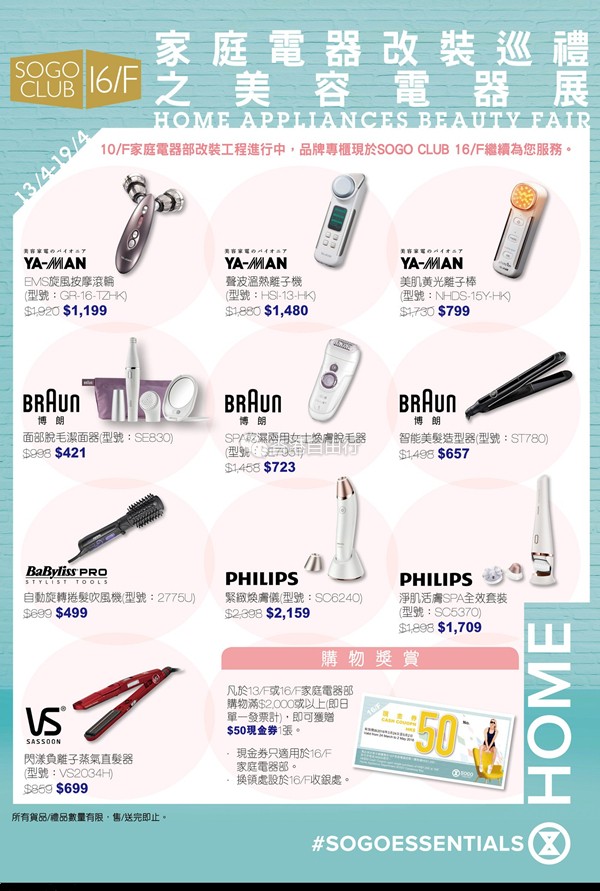 香港打折:sogo崇光百货铜锣湾店16F家庭电器改装巡礼之美容电器展(16年4月13日至4月19日)