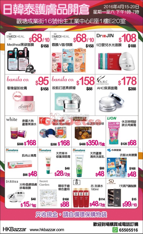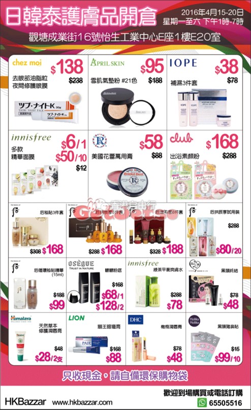 香港打折:日韩泰护肤品开仓低至3折购物优惠(至16年4月20日)