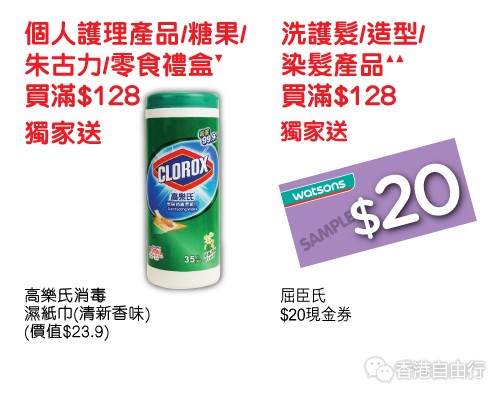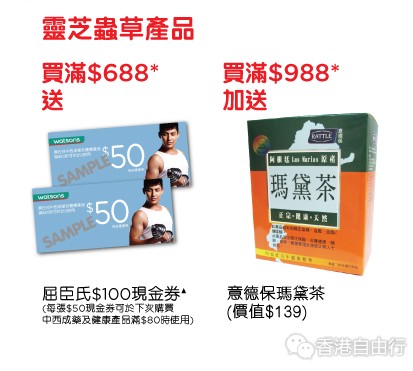 优惠以单一发票及折实价计算,优惠数量有限,送/换完即止。*白兰氏鸡精及燕窝系列、燕之家专柜、启泰专柜及指定产品除外。不可与其他优惠同时使用。▼婴儿奶粉、纸尿片及Sebamed除外。^Skin Advanced, Skin Advanced Men, Target Pro by Watsons及指定产品除外。现金券有效期不少于7日。