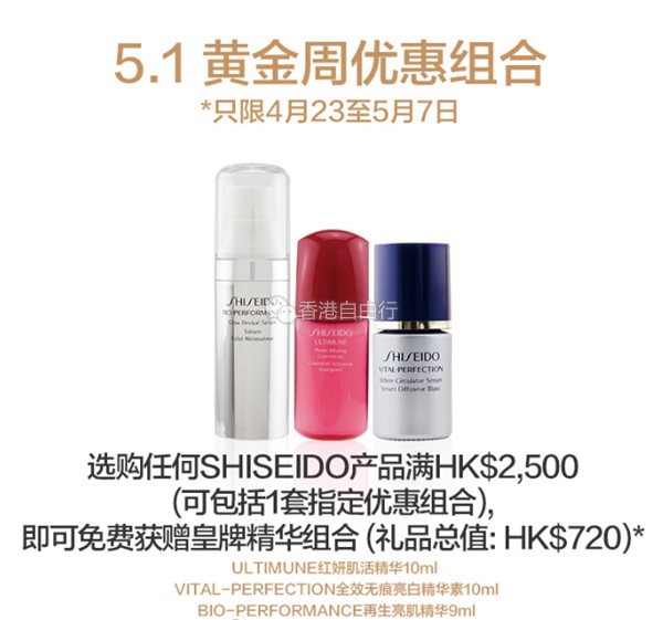 于即日至5月7日选购任何SHISEIDO产品满HK$2,500 (可包括1套指定优惠组合),即可获赠大热皇牌精华组合,立即与闺蜜分享,让肌肤能保持最好的状态,一起共度丰盛美丽的假期!