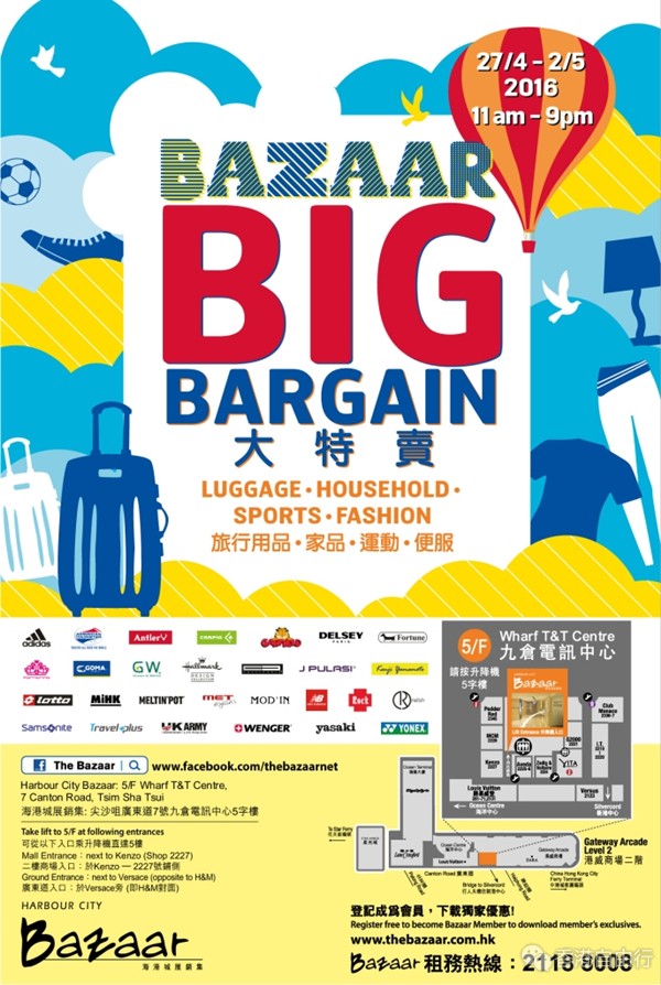 香港打折:海港城Bazaar旅行用品、家品、运动、便服大特卖(2016年4月27日至5月2日);