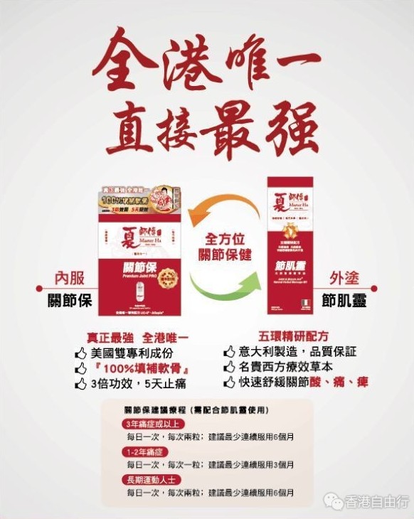 全港唯一、专利配方、直接最强的夏师傅“关节保”润滑关节组织,帮助软骨重生,韧带和筋腱更灵活,减轻及舒缓关节僵硬及不适问题,改善关节灵活性及活动能力;而“节肌灵”可即时减轻关节及肌肉不适问题,增强关节及肌肉灵活性,提升关节及肌肉活动能力,加强运动前后对关节的保护。