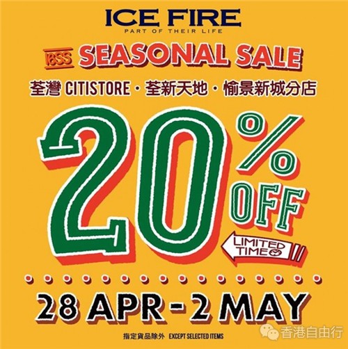 香港打折:ICE FIRE荃湾区一连五天八折购物优惠(16年4月28日至5月2日)