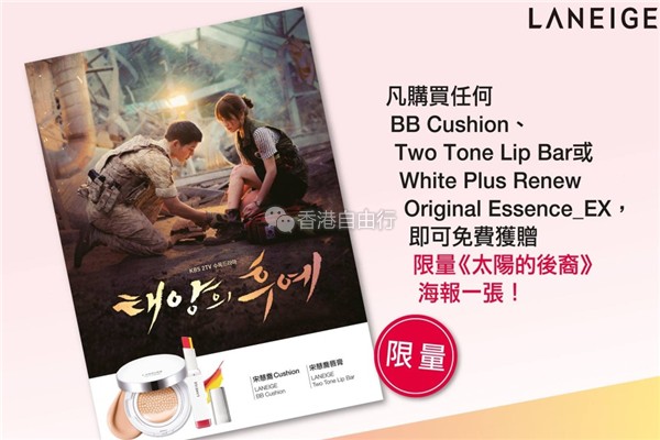 兰芝香港优惠直递:现凡购买任何BB Cushion霜丶双色渐变唇膏或雪漾亮白精华原液升级版,即可免费获赠限量太阳的后裔海报一张,还有多款限量优惠套装,快点来兰芝各分店及专柜选购心仪套装,打造如宋慧乔般的水光肌及轻透无瑕底妆!