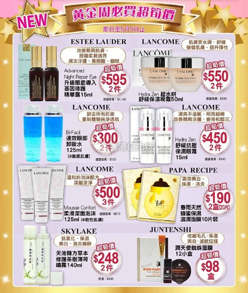 香港打折:雅施化妆品 五一黄金周必买超笋价购物优惠(至16年5月5日)