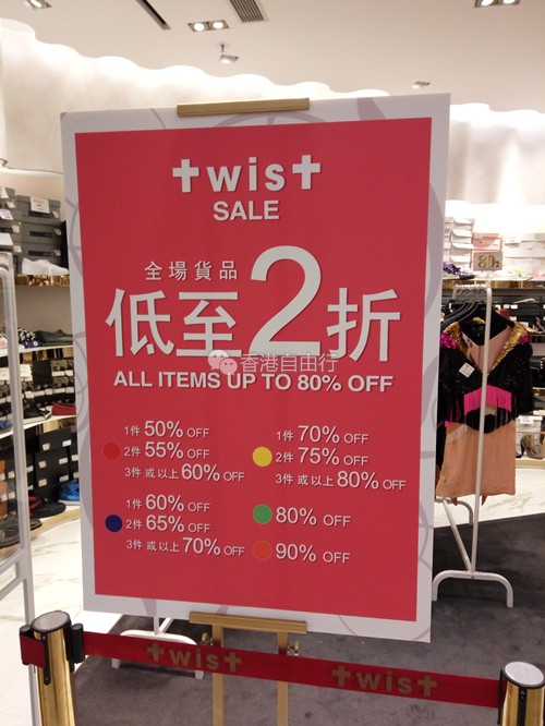 出示此电子优惠券到TWIST皇室堡分店购物,可享原有折扣再减1折(+10% off)优惠,即货品低至2折起。