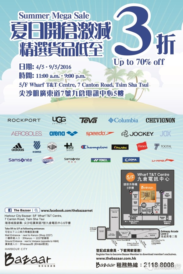 香港打折:海港城 Bazaar夏日开仓激减精选货品低至3折(2016年5月4至9日);