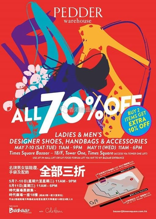 香港打折:时代广场Bazaar Pedder Warehouse Sale名牌男女鞋包配饰全部三折(16年5月7至11日)