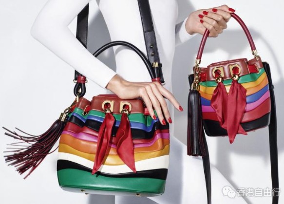 以Ferragamo 1938年推出的经典彩虹楔形鞋为灵感,用彩色皮革去演绎彩红纹路,其不规则的线条为手袋带来活力。仔细看更会发现手袋採用丝巾作装饰元素,而Sara Battaglia的招牌流苏就低调出现,作为挂饰点缀。