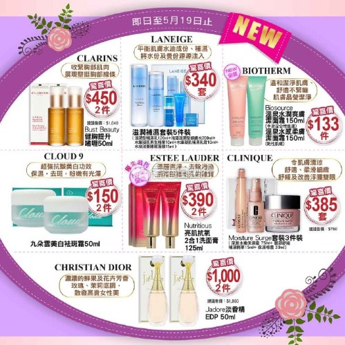 香港打折:九朵云$150两件!雅施最新店内化妆品购物优惠(16年5月13至19日)