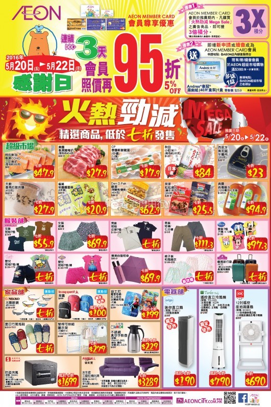 香港优惠:AEON火热劲减 精选货品低于7折发售(5月20至22日)