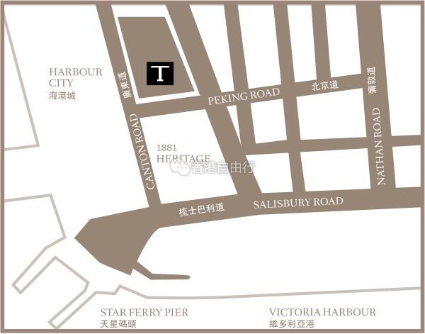 位于尖沙咀广东道与北京道交会处,尖沙咀购物中心地带,从尖沙咀地铁站出口步行五分钟即到。