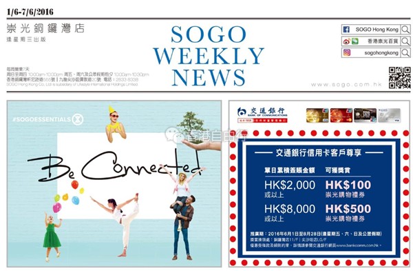 香港打折:SOGO崇光百货铜锣湾及尖沙咀店本周最新购物优惠(至16年6月7日)