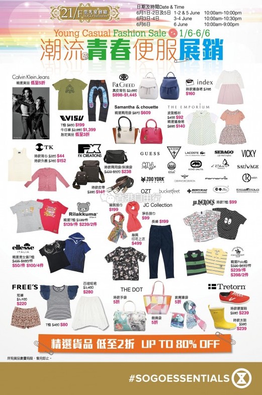 香港优惠:SOGO崇光百货铜锣湾店21F潮流青春便服展销低至2折(6月1至6日)