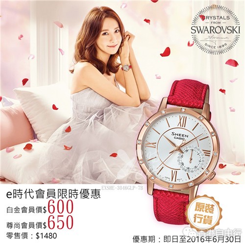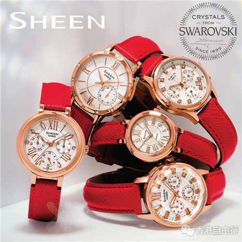 SHEEN 2016春夏系列以经典简约设计为主轴,是款知性与感性兼具的时尚单品,表款镶嵌施华洛世奇水晶点缀,表壳均採用淡雅玫瑰金处理搭配,热情火红的真皮表带衬托雪白表盘,散发出轻熟女魅力外,更凸显出整体的设计感,而在整点时刻、指针及表眼细节处则以金色点缀,此外,防水程度可达50米,增加了表款的实用性。