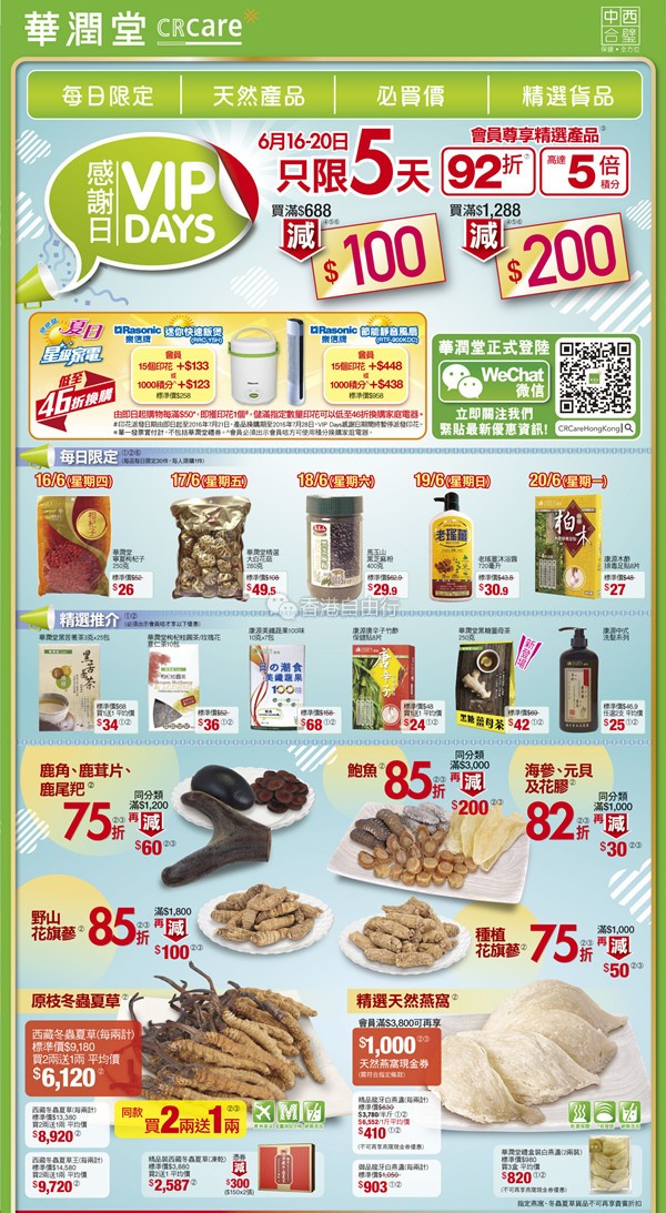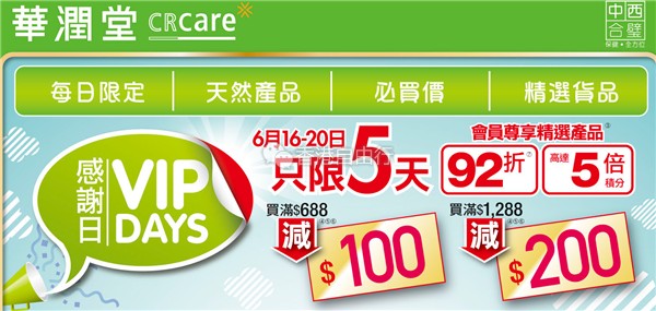 任何顾客于VIP DAYS感谢日期间购买多款健康保健产品均享劲减折扣,购物精选产品满$688即减$100,满$1,288即减$200,多款产品更可即时扣减优惠券,另外,每日将推出「每日1件精选笋货」,低至46折,天天不同惊喜!优惠有效期:6月16- 6月20日