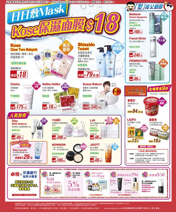香港打折:kose保湿面膜$18!卓悦Bonjour最新门市优惠(16年6月17至23日)