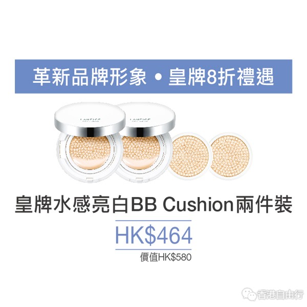顾客可以优惠价HK$464(8折)购买水感亮白BB Cushion气垫粉底2件装(任何颜色),不包括补充装。