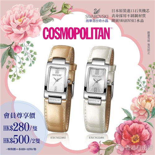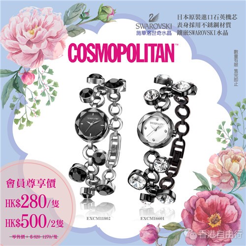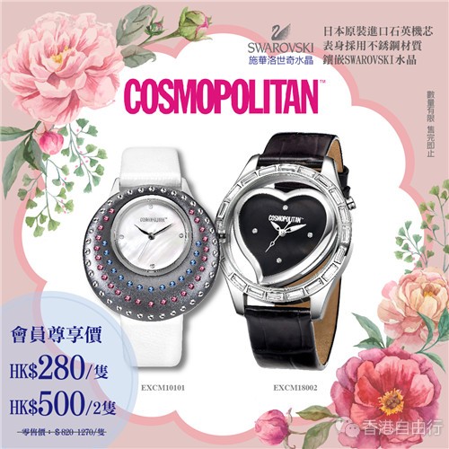 COSMO手表是由美国COSMOPOLITAN时尚杂志授权的时尚手表品牌,其设计时尚,个性鲜明,绝对是潮流的代表。手表用料名贵,日本原装进口石英机芯,表身採用不锈钢材质,镶嵌SWAROVSKI水晶,效果更为闪烁,而且还具有30米的生活防水性能。