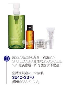 sogo铜锣湾店本周SHU UEMURA皇牌套装低至$640,还有旅行用品展低至6折,位于B2/F的崇光超市也带来了不少折扣,而尖沙咀店则有鞋履及夏季服饰等超多优惠。