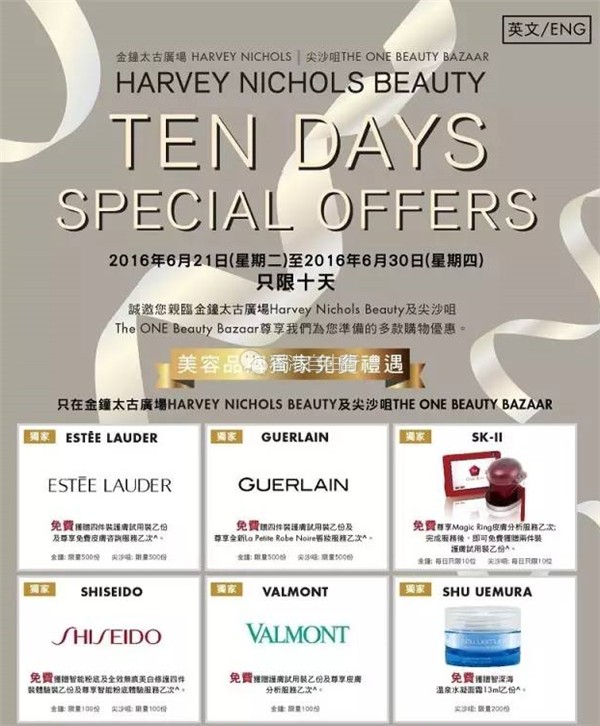 Harvey Nicholas10天限定美容折扣礼遇时间:6.21~6.30;地址:金钟太古广场/尖沙咀the one