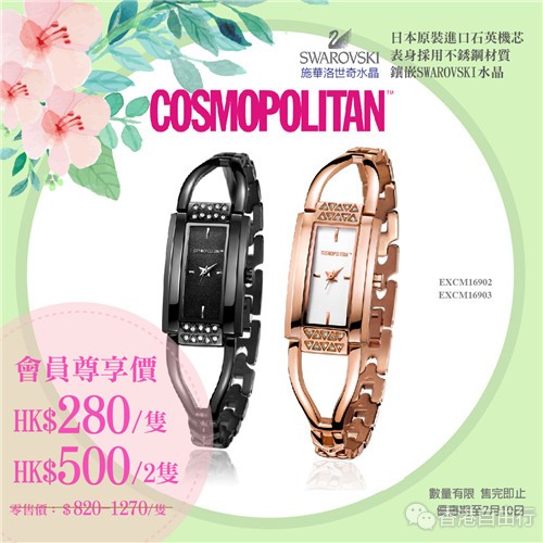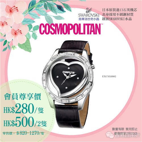 COSMO手表是由美国COSMOPOLITAN时尚杂志授权的时尚手表品牌,其设计时尚,个性鲜明,绝对是潮流的代表。手表用料名贵,日本原装进口石英机芯,表身採用不锈钢材质,镶嵌SWAROVSKI水晶,效果更为闪烁,而且还具有30米的生活防水性能。