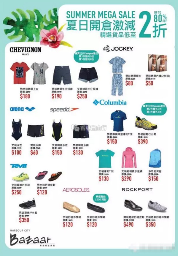 由2016年7月13 (星期三) 至7月18 (星期一) ,海港城Bazaar展销集将会一连6日举行品牌Bazaar Sale ,低至2折起,认真jetso!当中搜罗各大时尚潮流品牌包括法国牛仔便服Chevignon、英国生活品牌Cath Kidston、美国户外装备 Columbia、鞋履品牌Rockpock、Aerosoles及Teva、游泳用品品牌Arena及Speedo,而其他品牌则包括Jockey、JOX、Samsonite、American Tourister、Tootal、Forres、Champion、Hanes、K-Swiss、Palladium、OTZ、Prasidha、Swims & Wrung等等。