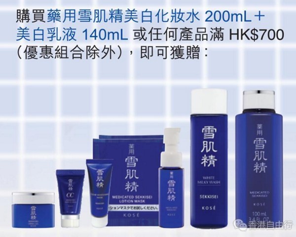 购买药用雪肌精美白化妆水200mL + 美白乳液 140mL或任何产品满 HK$700 (优惠组合除外),即可获赠: