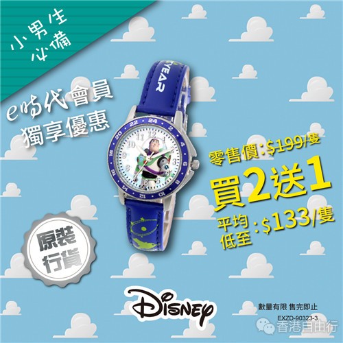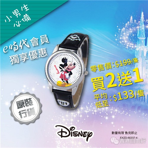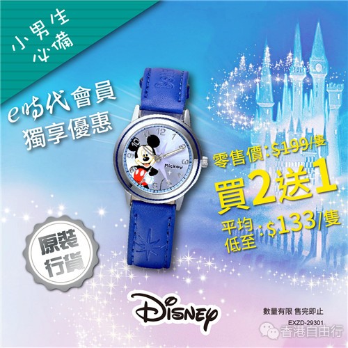 Disney儿童手表印有小朋友喜爱的卡通人物,无论小女孩或男孩都一定可以选购一只自己的最爱,e时代现推出夏日大优惠,买二送一,小朋友们快来购买吧!