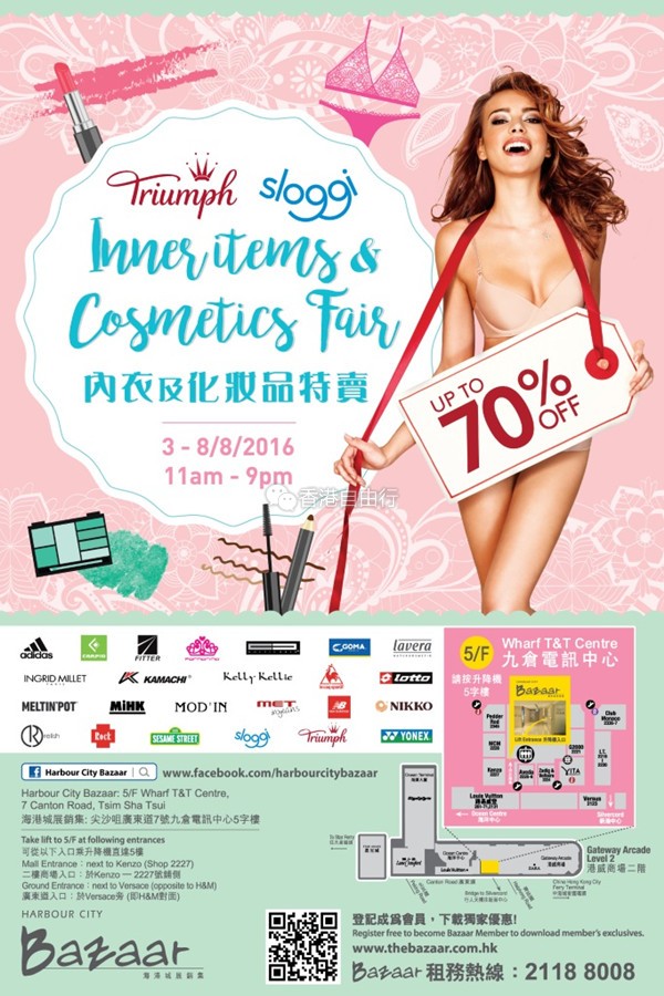 香港优惠:海港城Bazaar 内衣及化妆品特卖低至3折(2016年8月3至8日)