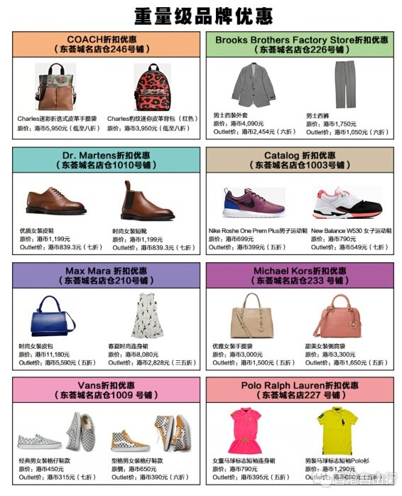 此外,场内其他重量级品牌亦同时提供超值折扣,如经典服饰品牌Max Mara Fashion Group、国际摩登服饰品牌Michael Kors及Coach、高级休闲服装Polo Ralph Lauren Factory Store、潮流服饰Catalog、优质商务服装Brooks Brothers Factory Store,还有新驻场内的世界知名服饰品牌BOSS.html" target="_blank">Hugo Boss、原创极限鞋服品牌Vans和流行鞋履ARTEns.html" target="_blank">Dr. Martens,劲减货品由时尚服饰、潮人服装及鞋履、上班套服应有尽有,万勿错过!