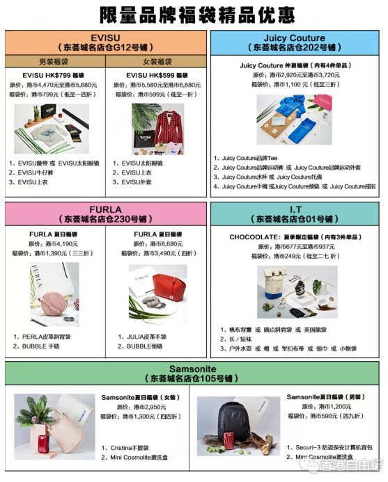 毗邻港铁东涌站C出口及香港国际机场,东荟城名店仓除了方便游客购物外,更是香港最多品牌的名店折扣商场,优质产品式式俱备。在“袋满好心情”推广活动期间,商场首次联同场内6个国际品牌推出超低价的福袋,包括知名女装服饰Juicy Couture、意大利著名品牌Furla、日本高端牛仔服装Evisu、香港本地潮牌I.T Outlet、高端电子产品DG Lifestyle及高级行李箱品牌Samsonite,均以非常特惠福价发售多项时尚产品,部分福袋更以低至原价近一折,是精明消费者的必然之选!