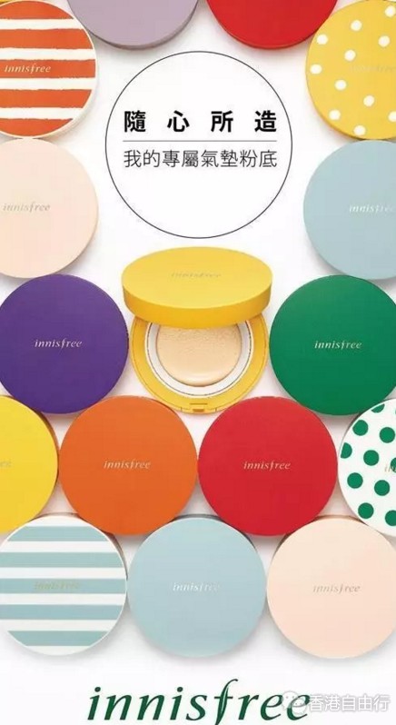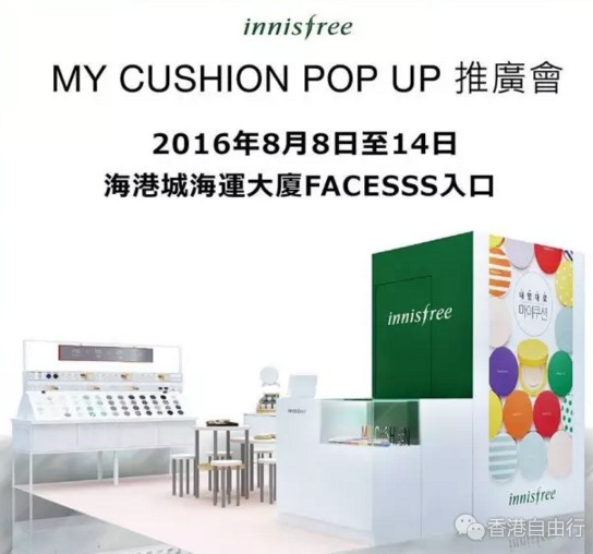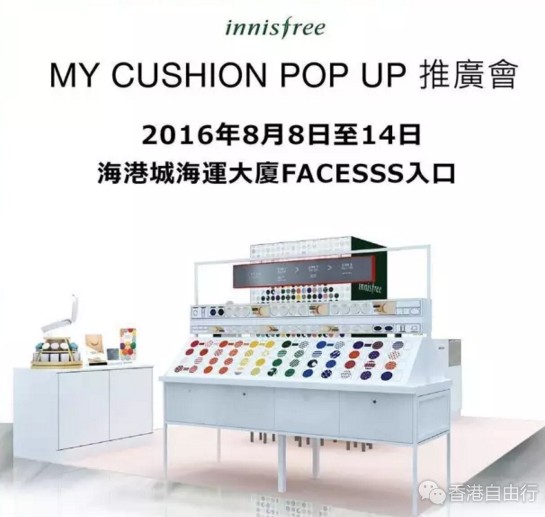 为庆祝MyCushion系列即将登场,innisfree在8月8日至14日于尖沙咀FACESSS举行推广会,并展出100款粉底盒、3款气垫粉底芯/调色底箱芯及4款不同的化妆工具! 诚邀大家亲临及见证 气垫粉底的新革命! 场内特设DIY专区,由您利用贴纸设计出个人专属粉底盒!