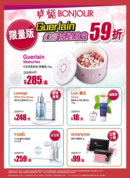 香港打折:卓悦每周激减优惠 娇兰幻彩流星粉盒59折,乔妹最爱兰芝精华原液$248(8月9至15)