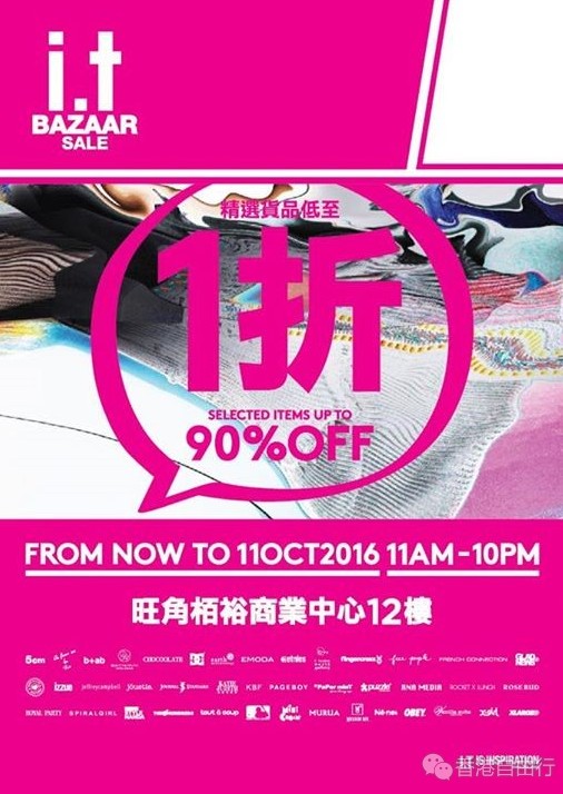 i.t Bazaar Sale已经开始!由即日起到10月11日,精选货品低至1折!多个潮流品牌5cm、b+ab、:CHOCOOLATE、fingercroxx、izzue、Mini Cream、Musium .Div、tout à coup、Venilla suite以及精选海外或日韩品牌货品任君选择,记住去旺角栢裕商业中心12楼选购你的心头好货!
