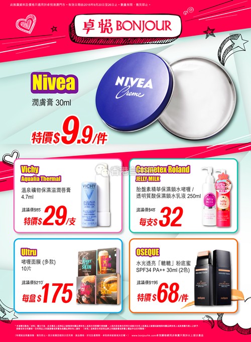 香港打折:卓悦每周激减优惠 NIVEA润肤膏特价$9.9一件(9月20至26日)