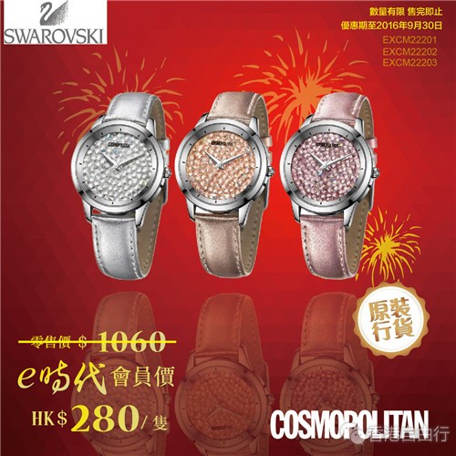 COSMO手表是由美国COSMOPOLITAN时尚杂志授权的时尚手表品牌,其设计时尚,个性鲜明,绝对是潮流的代表。手表用料名贵,日本原装进口石英机芯,表身採用不銹钢材质,镶嵌SWAROVSKI水晶,效果更为闪烁,而且还具有30米的生活防水性能。