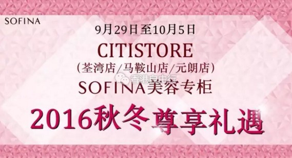 黄金周假期将至,大家心情是否有点小激动?更让MM们惊喜的护肤美妆优惠送到!9月29日至10月5日期间,CITISTORE千色百货 (荃湾店/马鞍山店/元朗店) SOFINA美容专柜将举行秋日特选尊享优惠,为大家挑选了多项皇牌防晒底妆优惠套装,精选独家礼遇限时限量推出,机会难得,立即预览您的心水,把握黄金假期尽情购物!