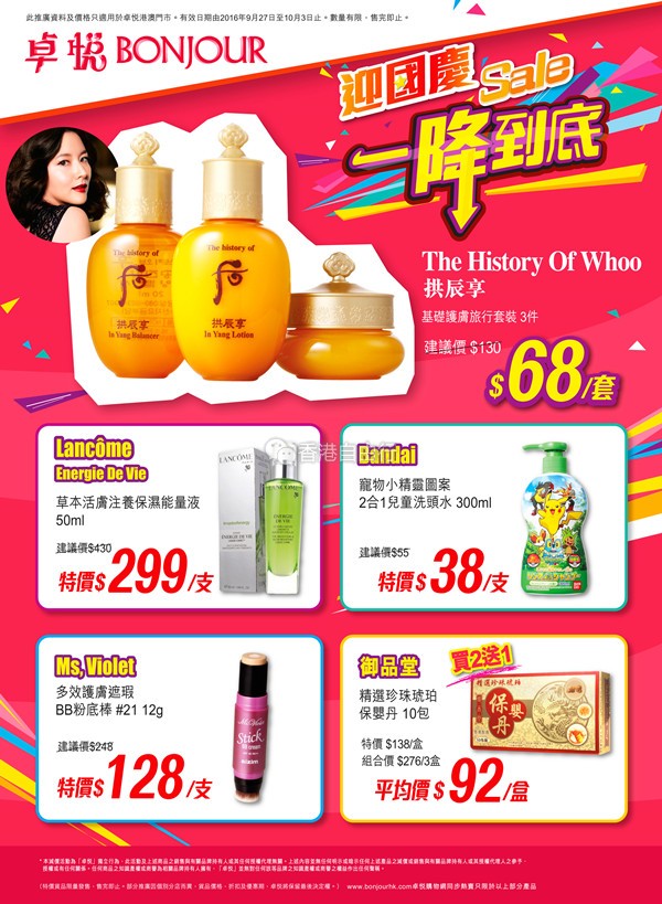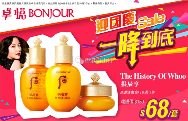 香港打折:WHOO后旅行套装$68/套 卓悦每周激减优惠(9月27至10月3日)