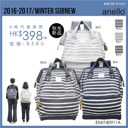 日本直送最新款Anello袋,款式好看,而且容量也很大,款式适合男女使用。另外,它同时可以当背包亦可手提使用,两种用法,方便大家配搭。今年日本都十分流行背背包,大家也想找一个休闲容易搭配的背包,就可以选择日本人气的Anello背包!(关注E时代微信即可免费注册会员享受会员价!)