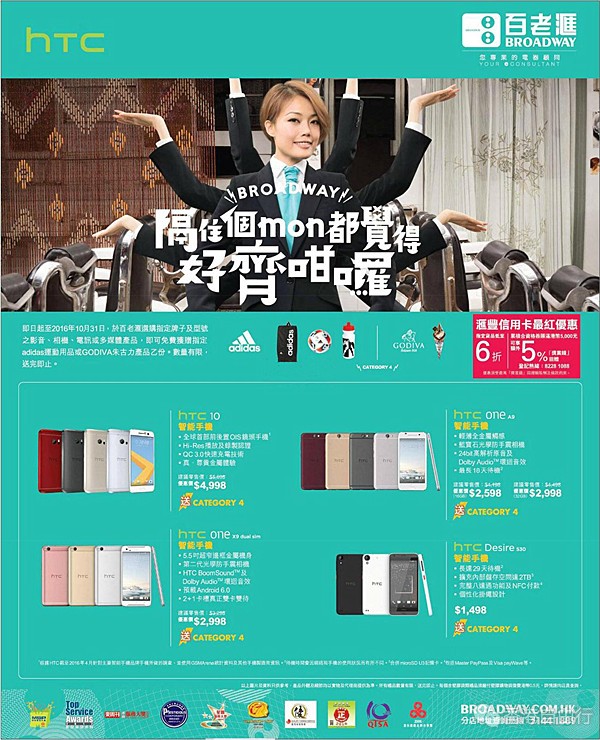 ➡由即日起至2016年10月31日,于百老汇选购指定牌子及型号之影音、相机、电讯或多媒体产品,即可免费获赠指定adidas运动用品或godiva朱古力产品1份,数量有限,送完即止。