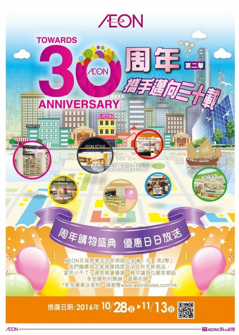 香港优惠:AEON30周年购物盛典(雅漾、THERMOS、TIGER、行李箱包、鞋服等)10月28至11月13日