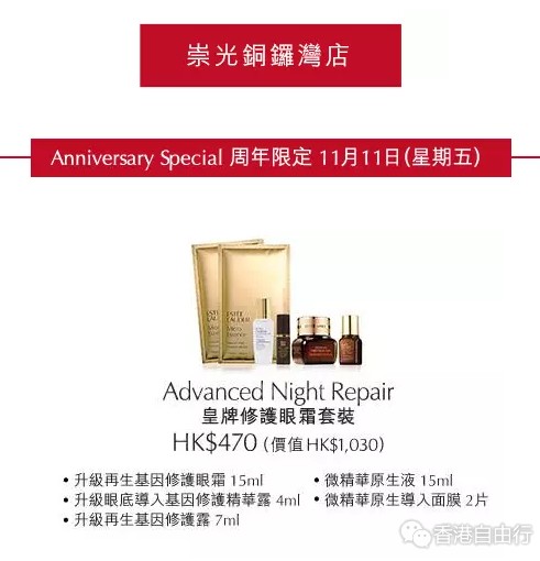平时觉得雅诗兰黛贵的姐妹们,这次机会来了~皇牌修护眼霜套装HKD470就能到手~绝对是疯抢的节奏!还有几天SOGO店庆就要来了!你们的子弹都准备好了吗?一起来看看店庆期间的各种优惠~