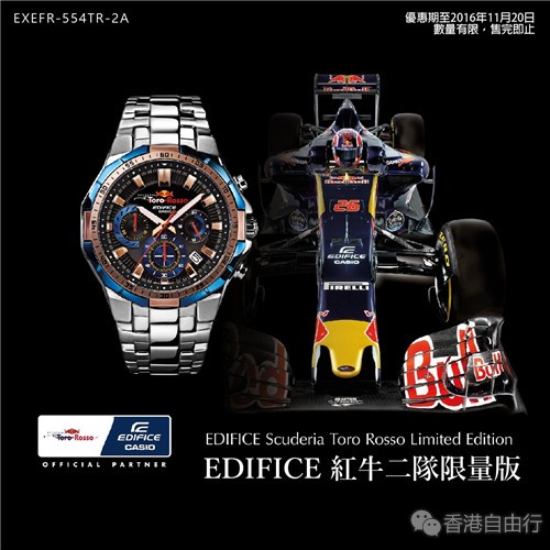 新的艾迪斐斯红牛二队限量版EFR-554TR是卡西欧与一级方程式车队红牛二队之间合作的首个款式。秒针和内置表盘指针採用车队专属红色,表壳以及时针分针则以海军蓝和金色作强调色,车队的标志印在表盘和后盖。三个内置小表盘则手表採用特别包装,并配有展示架和纪念卡。