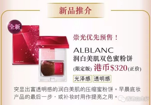 限定版ALBLANC润白美肌双色蜜粉饼于崇光感谢周第二击期间率先登场!作为早上底妆最后一步,能够突显透明妆效的压缩蜜粉饼,更能用作补妆时提亮肤色之用,加上其闪亮红彤造型,点亮您的圣诞气息,趁机率先入手这贴心小物吧!